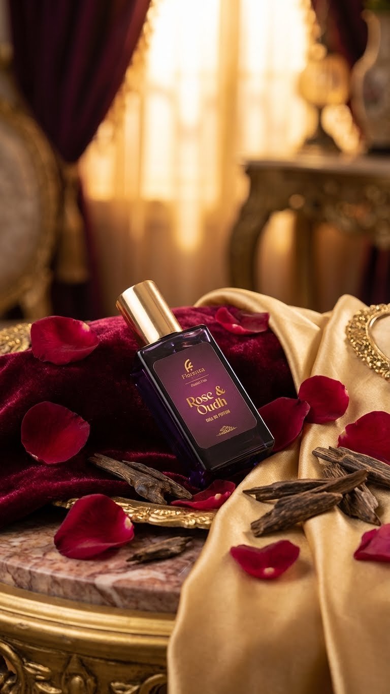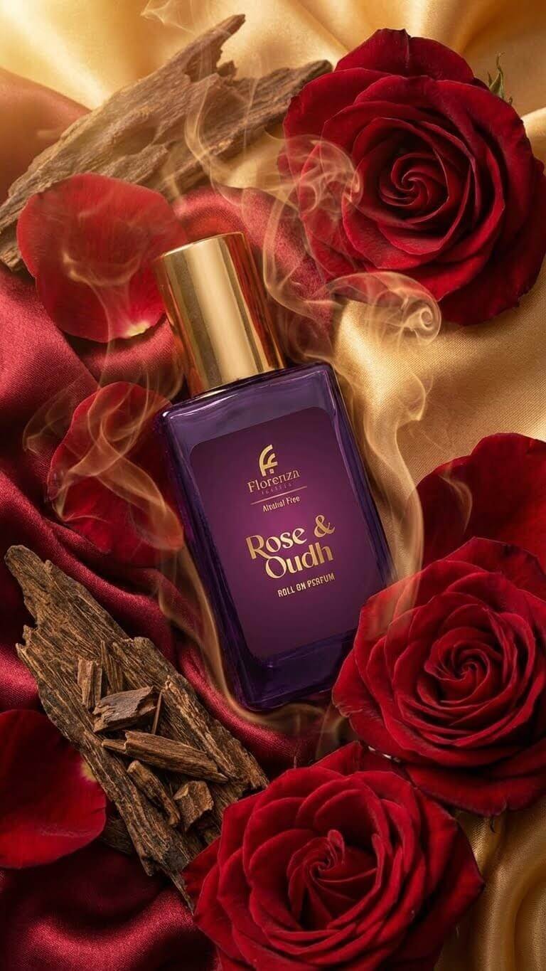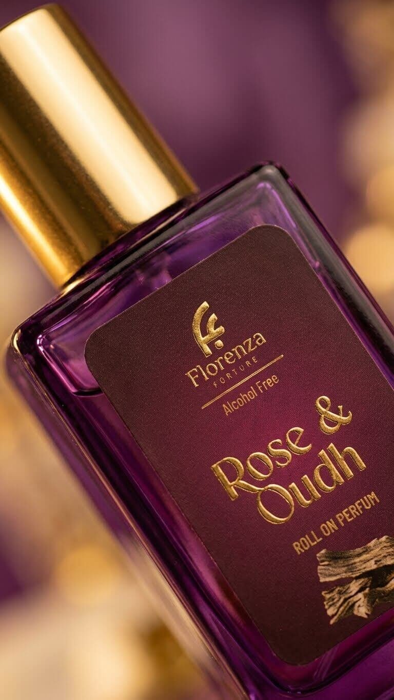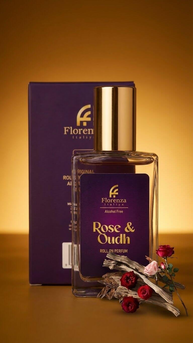 Indulge in the luxurious aroma of Rose & Oudh Roll-On Perfume by Florenza Italiya. A premium fragrance designed for men and women who appreciate long-lasting scents. Perfect blend of woody, amber, and musk notes, enhanced by hints of vetiver, labdanum, honey, and benzoin.